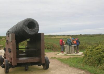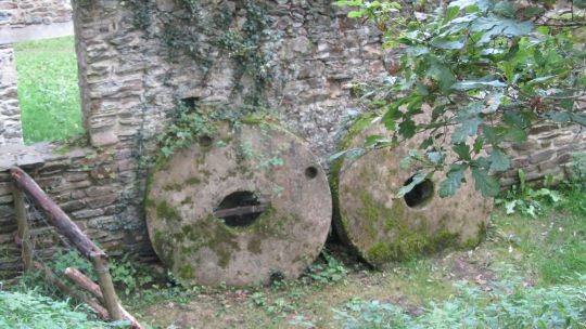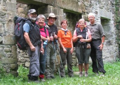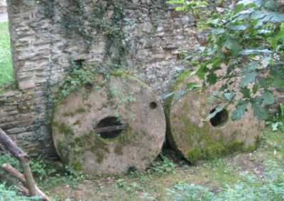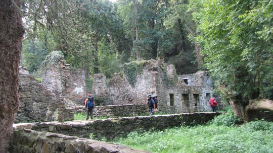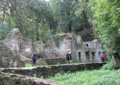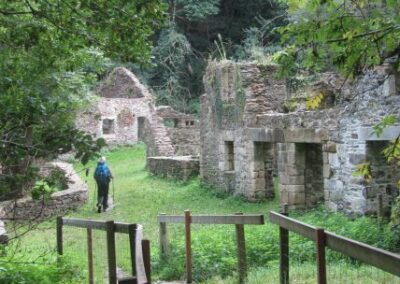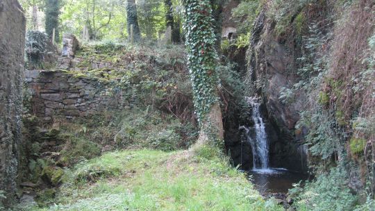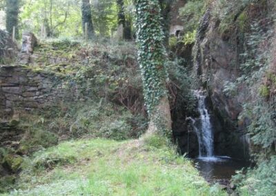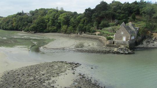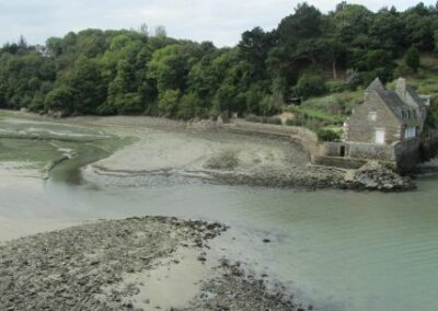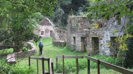 Après ce petit port, nous passons devant le moulin de la mer en cours de restauration, et remontons un estuaire par un sentier sous-bois jusqu’aux ruines de l’ancien moulin. Nous passons quelques temps dans ces ruines avant de repartir vers l’embouchure de l’estuaire par l’autre côté. Le chemin est un peu plus difficile tantôt glissant tantôt caillouteux.