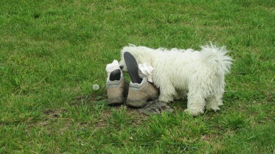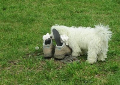 Mais elle accepte gentiment de nous remplir les gourdes. Pendant le repas des voitures s’arrêtent pour nous demander où se trouve l’église ? Elle est devant eux ??? Ils nous avouent être du Pas-de-Calais. Un petit chien est très intéressé par les chaussures déposées un peu plus loin.