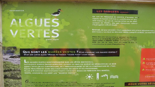 Nous nous enfonçons au fond de l’anse d’Yffiniac que nous atteignons rapidement. En s’écartant de la mer, nous retrouvons les panneaux de mise en garde. C’est tout le secteur qui est menacé par les algues vertes.